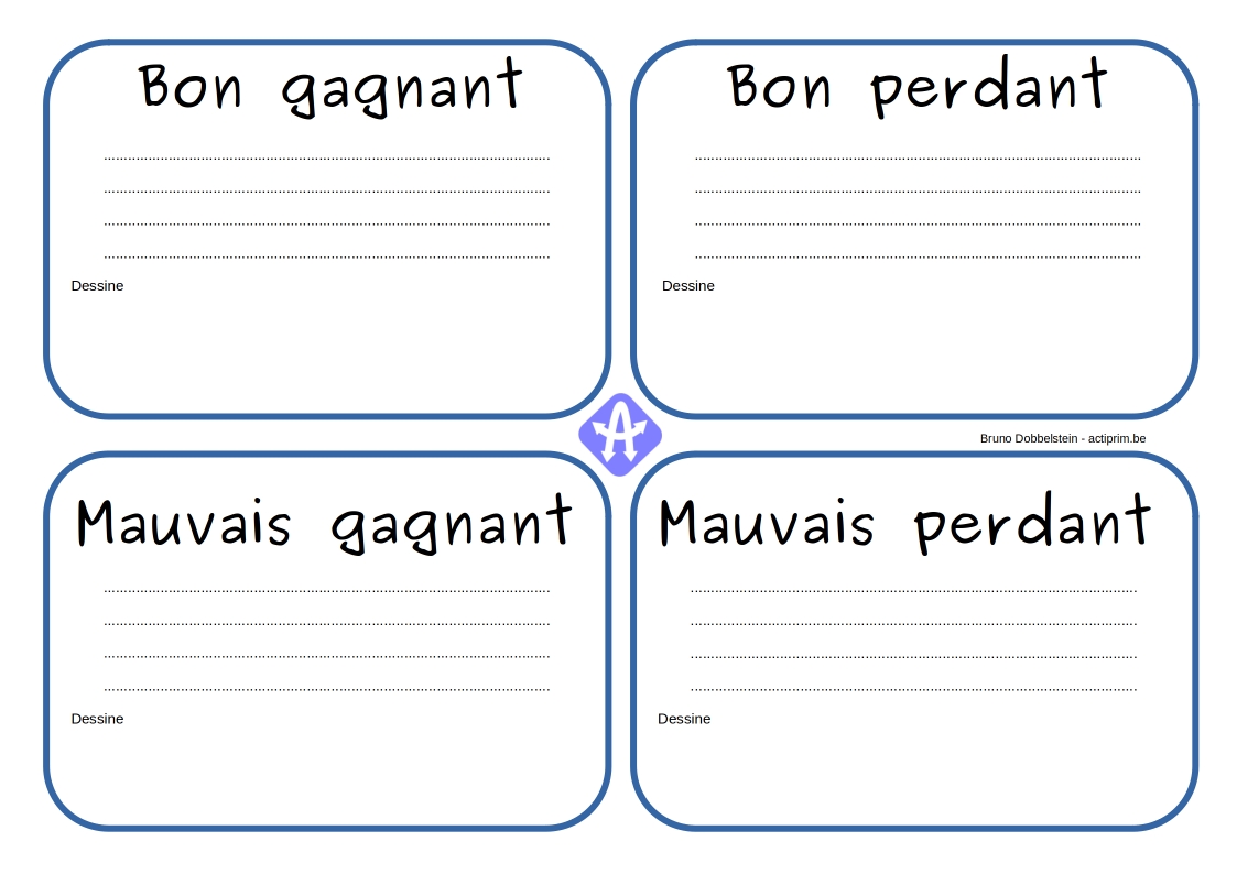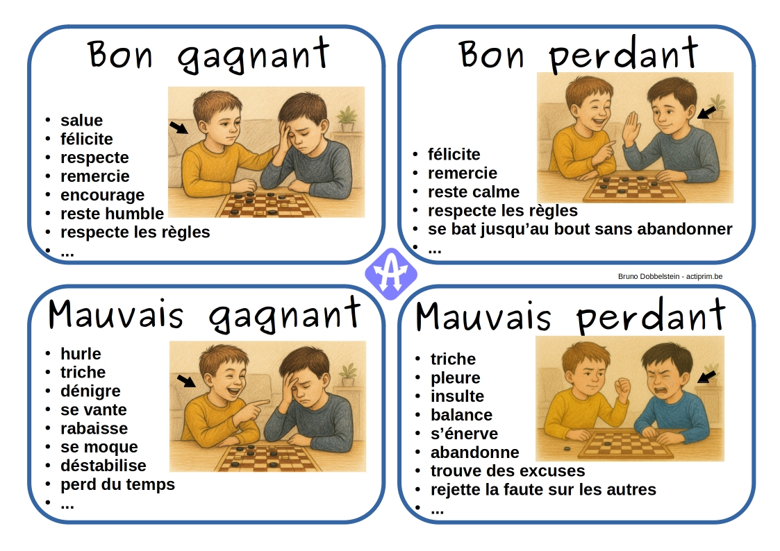 Pour améliorer l’ambiance et les relations dans les cours de récréation, voici un document pour inviter les enfants (et adultes) à prendre conscience des critères d’un bon et mauvais gagnant.